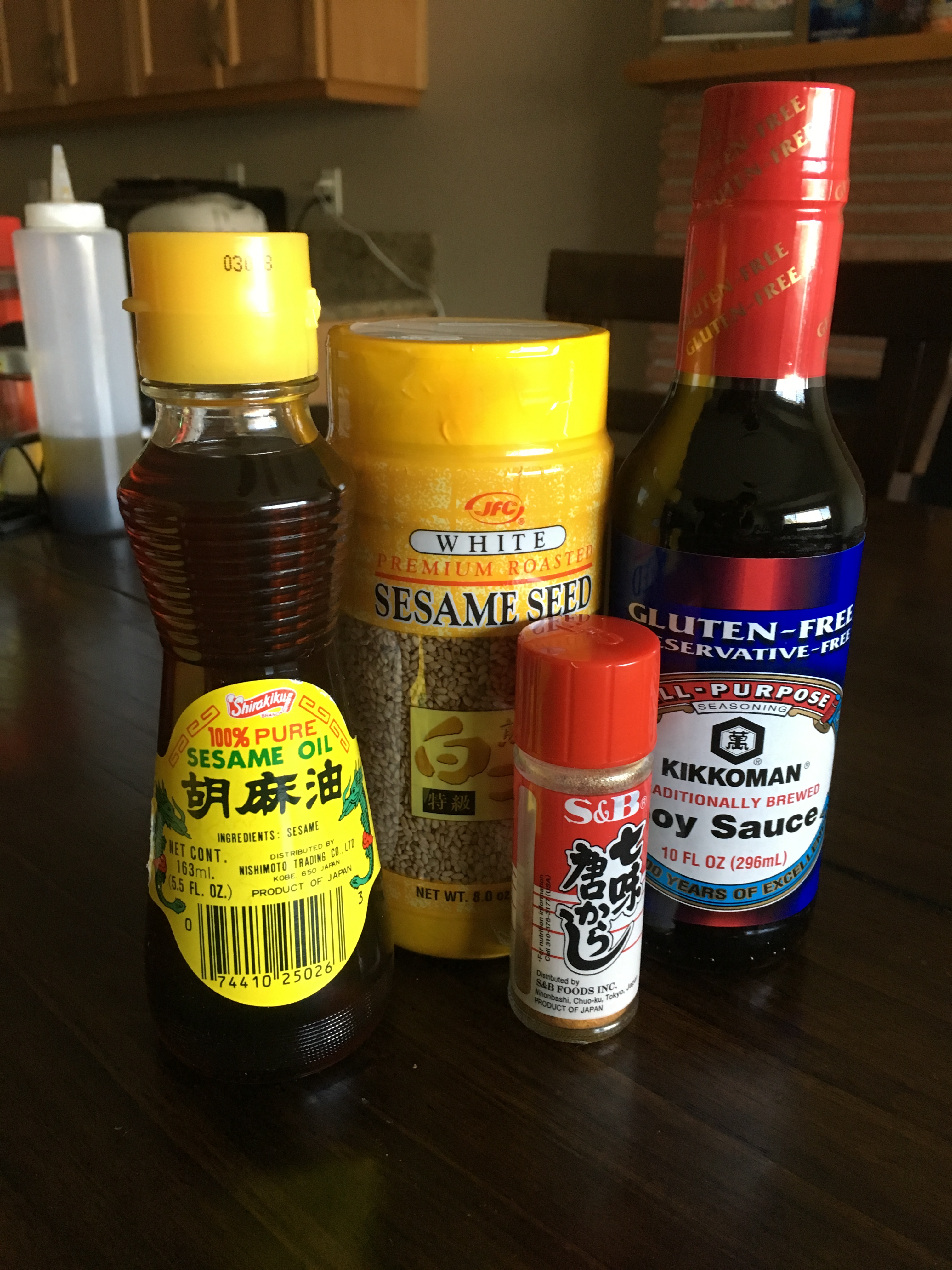 Most sesame seeds are standard so no need to be picky.  I love this brand of sesame oil, but you don't have to have it.  And of course this is my favorite soy sauce.  The togarashi is just a great addition.