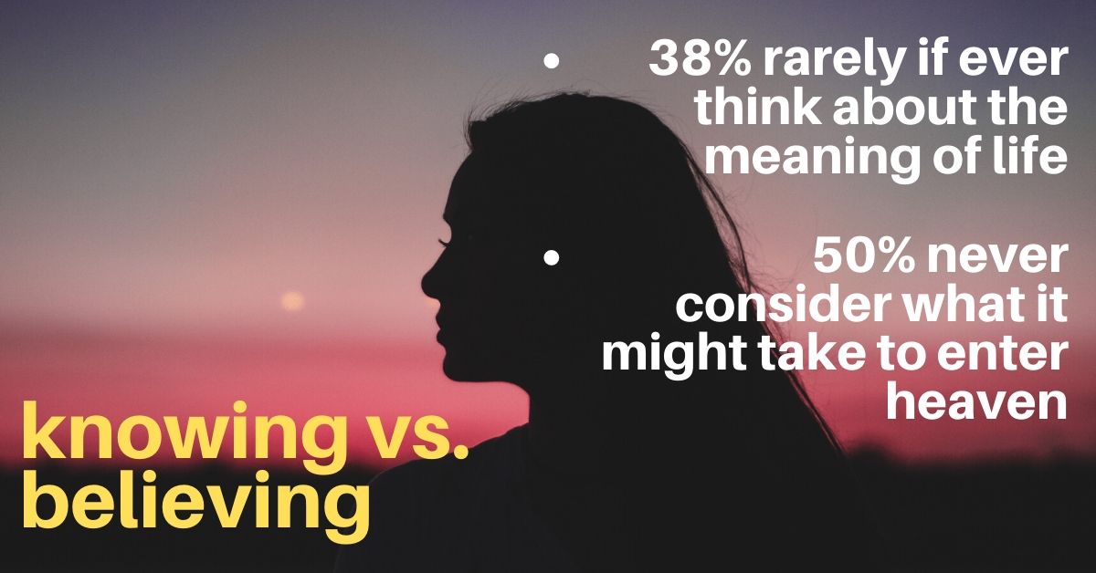 Knowing God is at the heart of all things and believing he is are two different ideas altogether. Finding that peace in your life doesn’t come from the head but from the heart. And most people don’t spend enough time thinking about God for it to really sink in to their heart even if they do a bunch of good stuff. When asked how often they think about the deeper meaning of their lives, 38% of people barely think about it if at all. When asked if they thought about going to heaven the results were worse. Only 11% thought about it yearly and a whopping 46% never thought about it at all. And it gets worse still. When asked if they “think often about what I must do to experience peace in the afterlife,” 50% of people said they didn’t.[8] As a society, we pay lip service to knowing God and finding the meaning of life, but too often we don’t think about it much at all. Part of that is the hectic nature of life. But part of it is that we just don’t make it a priority.