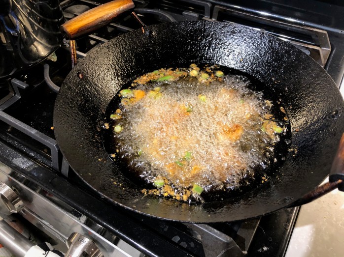 Deep fry the chicken until golden brown. They will darken slightly more after you pull them out of the oil. I use a non-reactive oil like canola oil but peanut oil works great too. Don’t use olive oil unless you REALLY like that taste because it will absorb