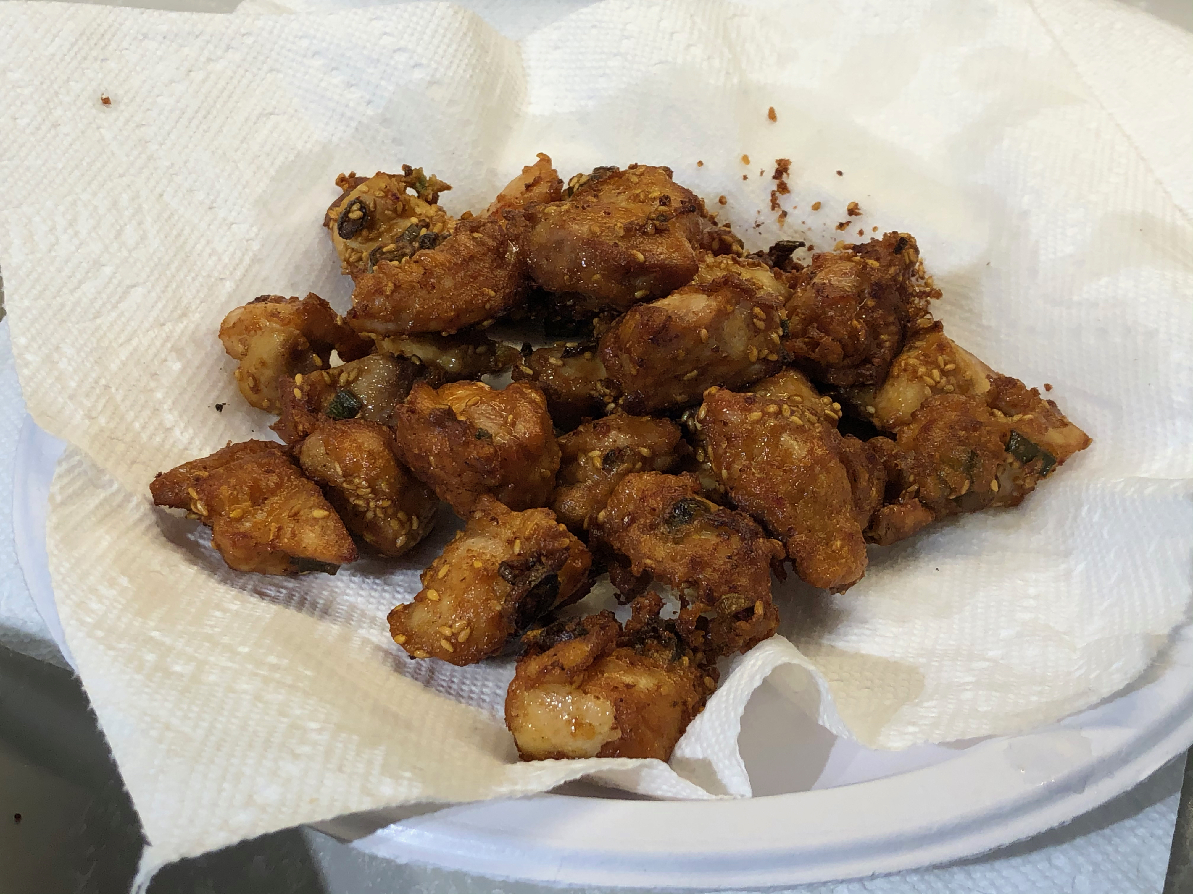 When prepping the chicken the ladies at UJCC taught me to use a small knife and whittle away the fat. You don’t have to be perfect at it, but cutting the stringy fat especially makes it more meaty and flavorful. Make sure to flip over thigh as you can find fat everywhere. Take note of any pockets of fat too. They like to hide sometimes. While cooking, I like to skim the top of the oil for all those flavorful crumbs to put on my rice afterward. The onions do double duty here – both as part of the flavor in the marinade AND as a rice topping. When all is said and done though, you’ll have a very flavorful and tasty main dish to serve friends and family! Enjoy!