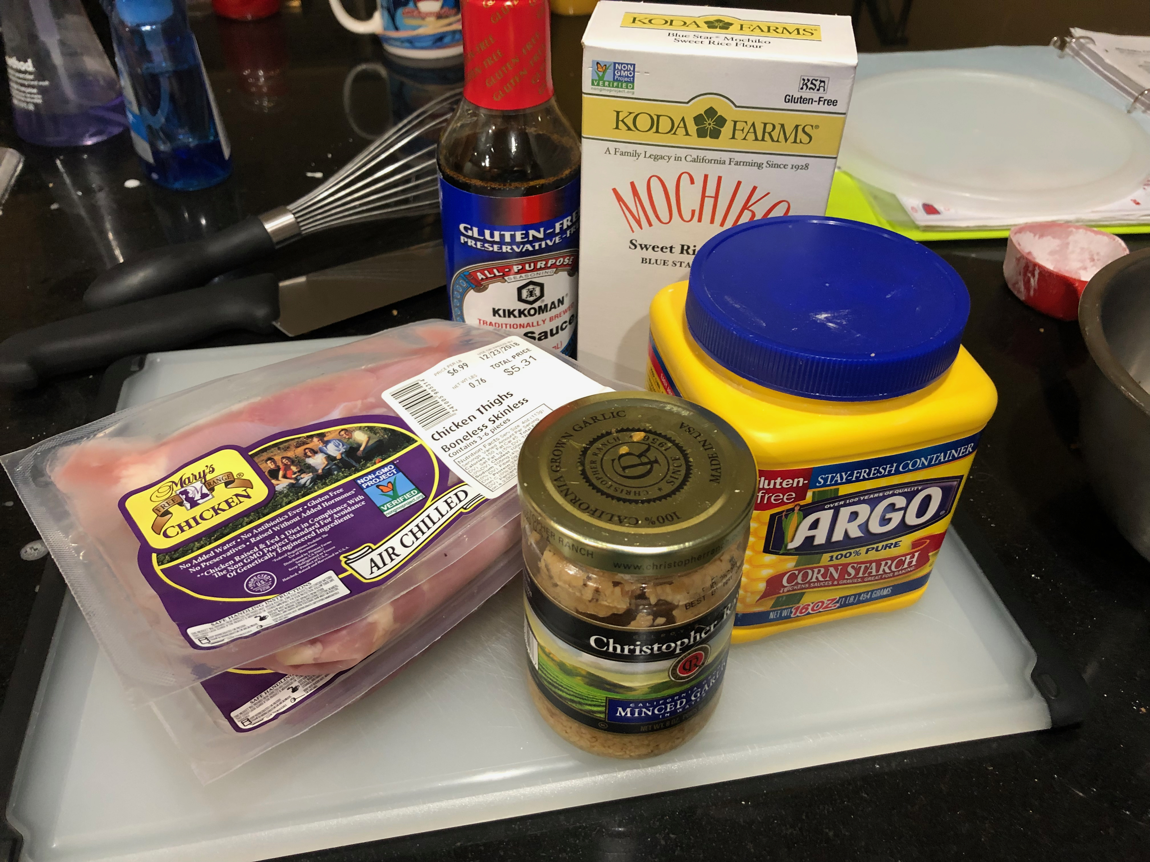 In a bowl big enough to hold your chicken, mix together the Mochiko flour, cornstarch, sugar, and salt