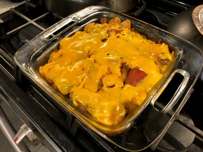 It’s pretty simple and straight-forward, but don’t feel bad if it doesn’t come out perfect. It took me years to get it right and many times I overcooked or burnt it. But now, I’ve got it down to a science – a tasty science, but a science nonetheless. I’ve substituted different items to see if I could improve the flavor, but the simplest is the best. I love the contrast in textures between the savory ground beef and the crunchy corn niblets and the squishy whole tomatoes. And make sure you use plenty of sharp cheddar cheese. It’s a cacophony of flavors, but it tastes so good.