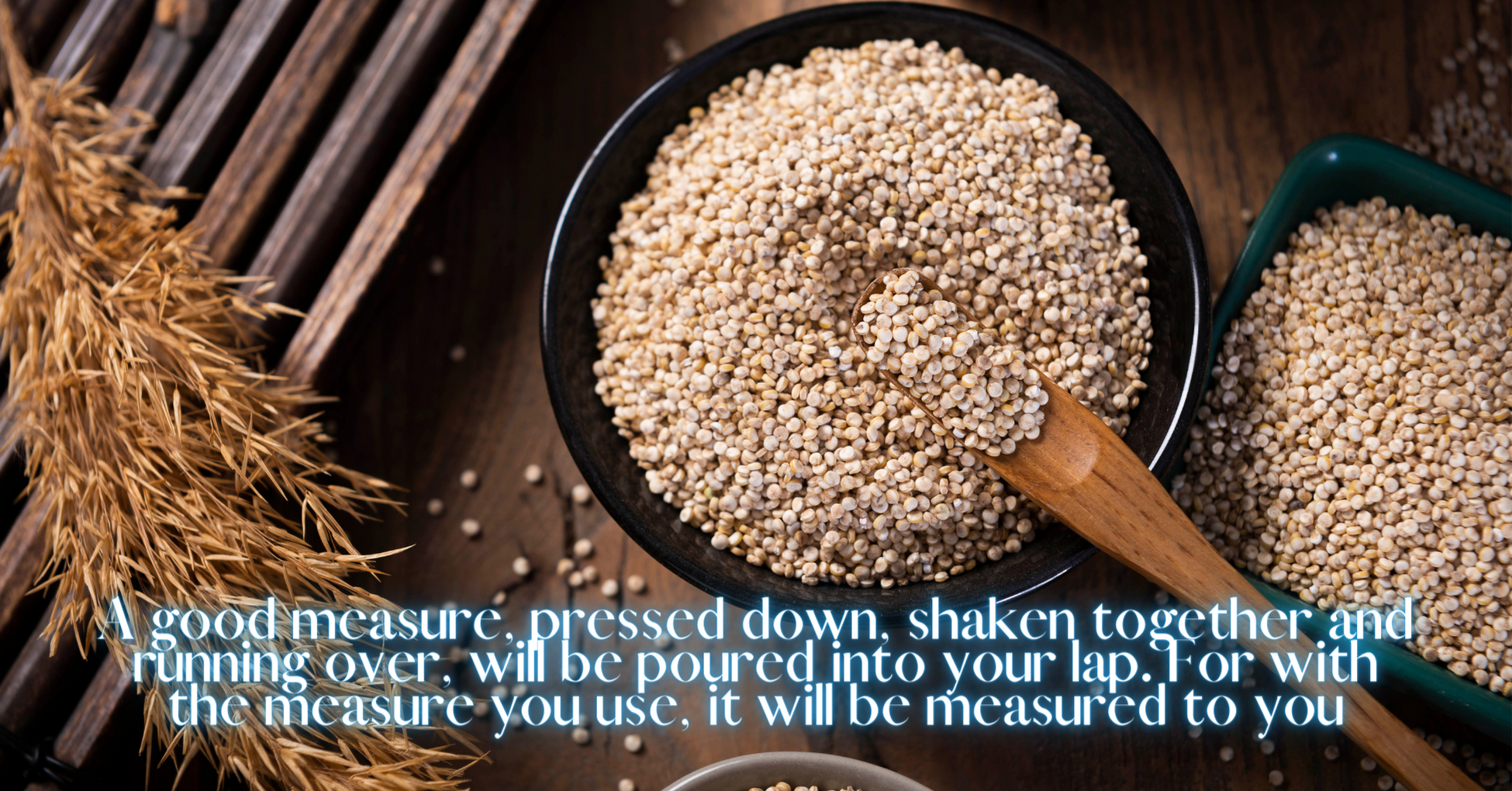 At first, the verse doesn’t seem to go that way. In fact, the little chapter subtitle is “Judging Others.” At least it is in my Bible. But looking closer at it, both of these verses are really about giving. “Do not judge, and you will not be judged” is just another way of saying that you should give the gift of grace to others because you will need that grace yourself from God. “Do not condemn, and you will not be condemned” is another way of saying that we should give the gift of mercy because we need God’s mercy to get into Heaven. And “Forgive, and you will be forgiven” is along the same lines. There isn’t a one of us that doesn’t need God’s forgiveness. Then Jesus sums it up with verse 38. “Give, and it will be given to you. A good measure, pressed down, shaken together and running over, will be poured into your lap. For with the measure you use, it will be measured to you.” Jesus re-emphasizes here the importance of giving and offers an example people of his day would be familiar with. A person going to market would often bring a cup or bowl to measure the grain he was purchasing. Grain wasn’t sold by weight but by volume so after agreeing on a price, the seller would then fill the bowl to the top.[4] A “good” measure was one where the seller would make sure you got your money’s worth. After filling the bowl, they would press it down, then shake it to settle any loose grain, and then pour more grain until it was running over and then literally pour that into your lap. You would usually come to market with a loose-fitting tunic for just that purpose, to carry things like grain back to your home. Since the seller would fill the bowl to overflowing, it would be too hard to carry without spilling in the bowl. This is the kind of abundance we should be giving to others. “For with the measure you use, it will be measured to you.”