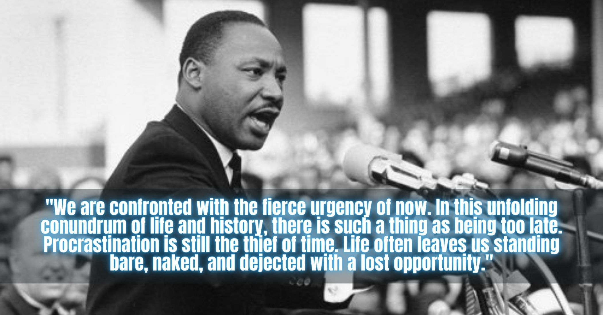 We are now faced with the fact, my friends, that tomorrow is today. We are confronted with the fierce urgency of now. In this unfolding conundrum of life and history, there is such a thing as being too late. Procrastination is still the thief of time. Life often leaves us standing bare, naked, and dejected with a lost opportunity. The tide in the affairs of men does not remain at flood—it ebbs. We may cry out desperately for time to pause in her passage, but time is adamant to every plea and rushes on. Over the bleached bones and jumbled residues of numerous civilizations are written the pathetic words, “Too late.” There is an invisible book of life that faithfully records our vigilance or our neglect.[7]