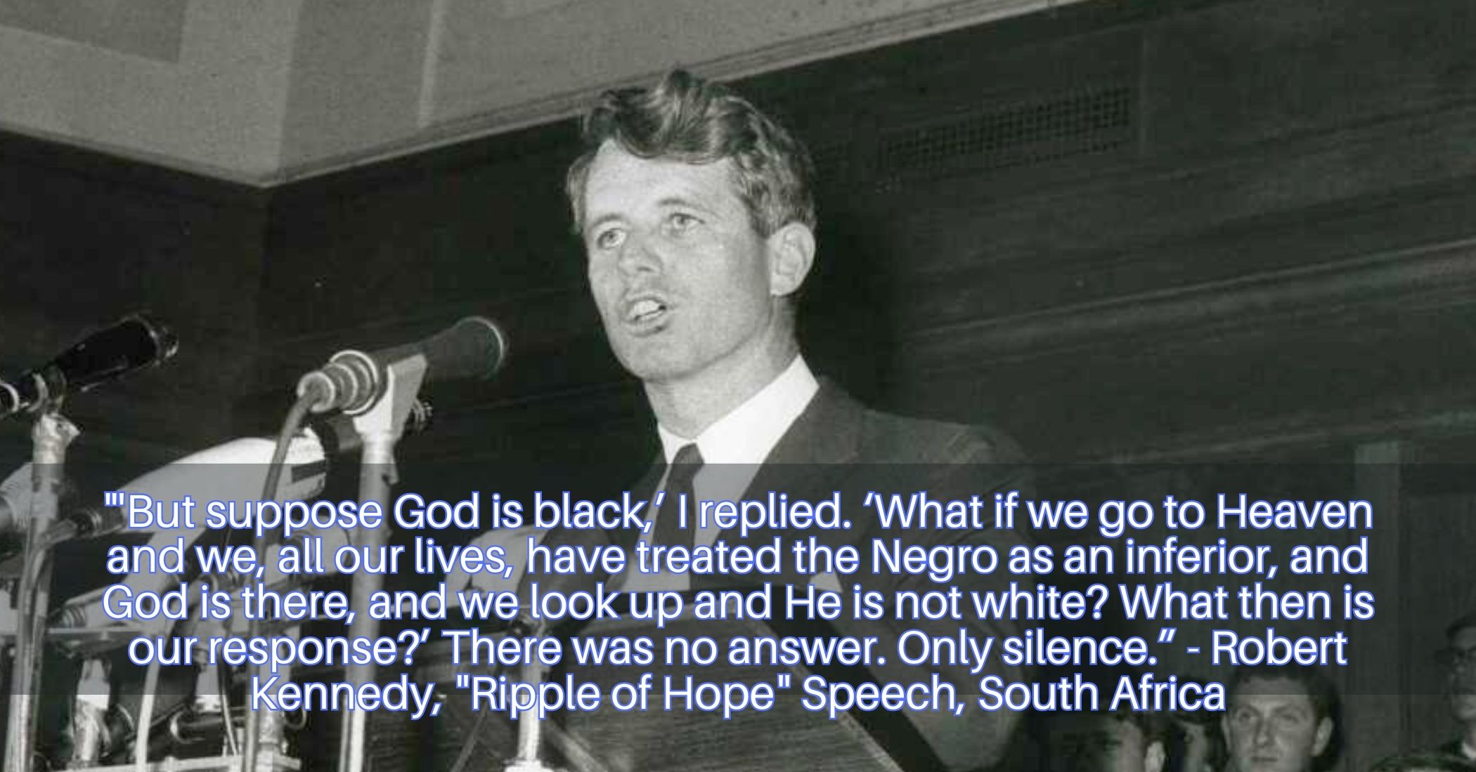 Robert Kennedy wrote about his experience in South Africa when that country was still practicing apartheid – a system of racial segregation which classified white citizens higher than anyone else in society. In part, the white population justified their treatment of Coloured and Black people based on the Bible, saying this was part of God’s plan.[5] When Robert Kennedy went to visit, the government didn’t want to approve his visa, but most people thought he could be the next President of the United States and the South African government didn’t want to have bad relations with the next leader of America so they reluctantly let him in.[6] This is a part of what he wrote about his experience: “During five days this summer, my wife Ethel and I visited South Africa, talking to all kinds of people representing all viewpoints. Wherever we went-Pretoria, Cape Town, Durban, Stellenbosch, Johannesburg – apartheid was at the heart of the discussion and debate. Our aim was not simply to criticize but to engage in a dialogue to see if, together, we could elevate reason above prejudice and myth. At the University of Natal in Durban, I was told the church to which most of the white population belongs teaches apartheid as a moral necessity. A questioner declared that few churches allow black Africans to pray with the white because the Bible says that is the way it should be, because God created Negroes to serve. ‘But suppose God is black,’ I replied. ‘What if we go to Heaven and we, all our lives, have treated the Negro as an inferior, and God is there, and we look up and He is not white? What then is our response?’ There was no answer. Only silence.”[7]