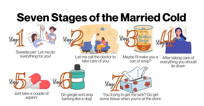 In your 1st year of marriage, if your loving spouse gets sick, you say with all sincerity – “Oh, sweetie pie, I’m really worried about those nasty sniffles you have! There’s no telling what that could turn into with all the strep that’s been going around. I’m going to take you right down to the hospital and have you admitted for a couple days of rest. I know the food is lousy there, so I’m going to bring you takeout from your favorite restaurant. I’ve already arranged it with the head nurse.”