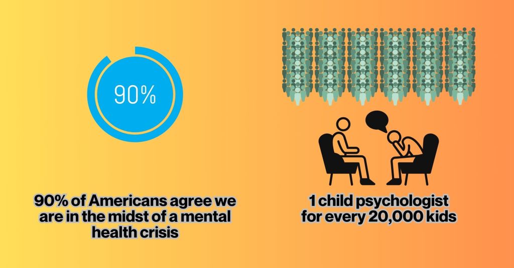 It impacts more than just our mental well-being but invades every aspect of our lives and the lives of those around us. Today, nearly 90% of Americans believe we are in the midst of a mental health crisis with over 50% of adults saying either they or a family member has experienced a severe mental health crisis personally. Those problems range from suicide to self-harm to homelessness to drug overdoses to name just a few.[1] But even those in crisis don’t always get help, even when they want to. One in four adults said they thought they might need mental health services, but didn’t get them.[2] That’s more than 83 MILLION people.[3] Can you imagine that? The biggest impediments to getting care are probably not hard to guess: cost, lack of insurance coverage, and not enough providers.[4] “Sixty percent of psychologists reported having no openings for new patients…” in the latest 2022 survey.[5] It gets even worse for kids. According to the American Psychological Association, half of the children who have a mental health disorder do not get the treatment they need, and this was before the pandemic.[6] It’s no wonder considering that for every 100,000 people under the age of 18, there are only about 5 psychologists trained to help them.[7] Five. That’s one psychologist for every 20,000 children. And those are centralized in usually urban and suburban areas. Children in rural neighborhoods generally don’t have access to any mental healthcare. Again, according to the APA that’s about 80% of the counties in America.[8] This doesn’t even take into account how mental illness contributes to homelessness or drug addiction.[9] It’s going to take more than chicken soup to solve this problem.