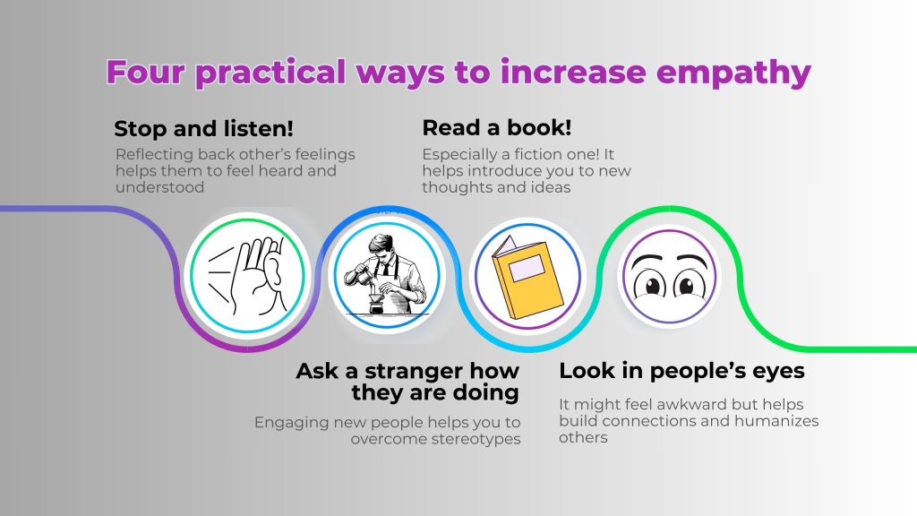 As evidenced by a recent study after the pandemic by the same team. They found young people today show about the same empathy as did their 1970’s counterparts![6] Our own capacity for empathy can grow too simply by trying.[7] It’s not just an innate trait. It’s something that can be learned with just a little bit of effort. I read an article in TIME magazine that offered four simple ways to help increase your empathy.[8] 1. Stop and listen – take time to really listen to other people. Learn to reflect back people’s feelings. It works. Even when you simply parrot what other people are saying, they often feel heard. And that is something powerful. 2. Ask your barista (or Subway sandwich person or Walmart store clerk) how their life is going. Just engaging other people connects you in different ways and helps you to see them not as stereotypes but as people. Take time to say “hi” to people you don’t know. 3. Read a book. This opens your mind to different thoughts and ideas. Especially when you read fiction books! And 4. Look into people’s eyes. The eyes say a lot about a person and being willing to look in another person’s eyes, creates a connection and can help you to better understand them. It might also feel awkward, but that’s okay.