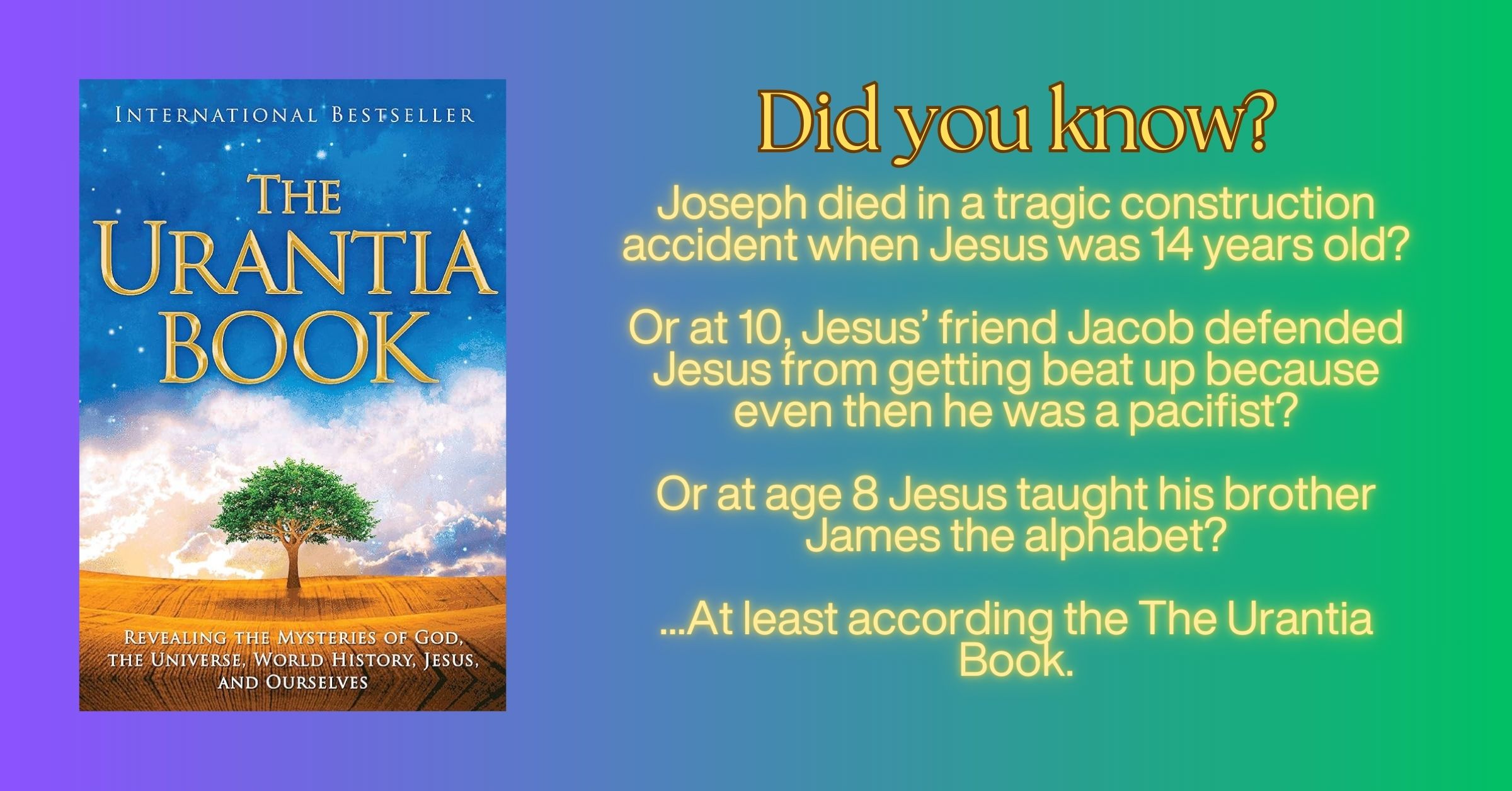The earthly father of our Lord and Savior Jesus Christ died in a construction accident when Jesus was still young, only 14 years of age. Joseph succumbed to the injuries he received when a derrick fell on top of him leaving him gravely injured. A messenger came for Mary to come immediately. For some strange reason, Mary decided to take James with her instead of Jesus to see what happened while leaving Jesus at home with his six other younger brothers and sisters. But Joseph died before Mary arrived and Jesus was now the head of the household. At least that’s what it says in The Urantia Book.[1] Also known as The Fifth Epochal Revelation, this tome was published in the first half of the 20th century after a period of 10 years where members of a small group were allowed to ask questions of a “sleeping subject” who received the transmissions of celestial beings. There are many other revelations about the life of Christ in this book, especially during his younger years. Like how Jesus loved to draw with charcoal or sculpt with clay when he was only nine years old.[2] At 10, Jesus had a friend, Jacob, the stone mason’s son, who defended Jesus from getting beat up since Jesus even then was a pacifist.[3] Age 6 was the first time Jesus could recall meeting John his cousin whom he played with on the roof of his house in the sand.[4] And did you know Jesus taught his brother James the alphabet when Jesus was only 8 years old?[5]