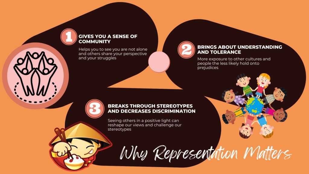 [3] The information here comes from two sources although many others support those sources: https://www.blackillustrations.com/blog/representation-matters-5-reasons-representation-in-media-matters and https://www.psychologytoday.com/us/blog/psychology-the-people/202112/why-representation-matters-and-why-it-s-still-not-enough