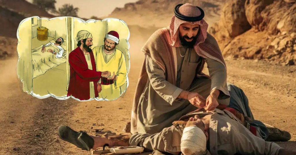 30 In reply Jesus said: “A man was going down from Jerusalem to Jericho, when he was attacked by robbers. They stripped him of his clothes, beat him and went away, leaving him half dead. 31 A priest happened to be going down the same road, and when he saw the man, he passed by on the other side. 32 So too, a Levite, when he came to the place and saw him, passed by on the other side. 33 But a Samaritan, as he traveled, came where the man was; and when he saw him, he took pity on him. 34 He went to him and bandaged his wounds, pouring on oil and wine. Then he put the man on his own donkey, brought him to an inn and took care of him. 35 The next day he took out two denarii[e] and gave them to the innkeeper. ‘Look after him,’ he said, ‘and when I return, I will reimburse you for any extra expense you may have.’