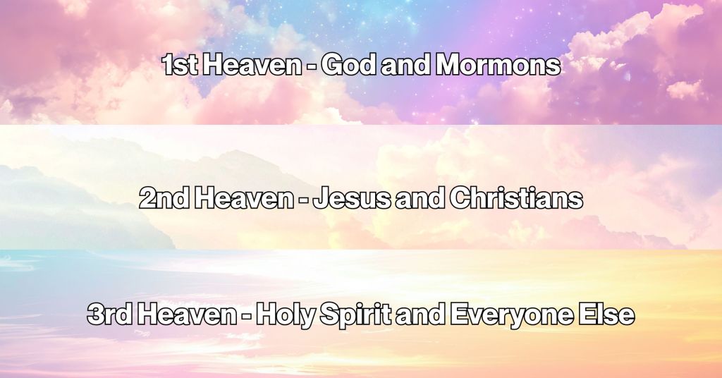 From my reading and understanding of both the Jehovah’s Witness belief and Mormon belief, neither one of them think Jesus was God in the sense we traditionally understand it. In the faith of the Jehovah’s Witness, Jesus was not God, but a creation of God. He was also known as the Archangel Michael and did not die on a cross but on a stake. When Jesus did die, he was not resurrected but existed only in spirit form. The Jehovah’s Witness were taught only 144,000 people would be taken to Heaven and the rest of humanity would remain dead. Not that they would go to hell but would simply cease to exist. They revised that interpretation to say that true believers after 1935 would be resurrected to a new Earth but that 144,000 who were chosen prior to 1914 would still be the only ones to go to Heaven.[7] My question is what happened to those “true believers” between 1914 and 1935? Mormons similarly don’t believe Jesus is actually God. Instead, they believe God, Jesus, and the Holy Spirit are different and distinct beings that act in unison with one another. It seems like a very subtle difference, but it denies that Christ is God and instead one of many gods. The Mormon faith also teaches we can eventually become God or at least as God is. They believe God and Jesus both have physical, perfected bodies, that God is made of flesh and bone so when we are created in his image that is a literal interpretation.[8] But then in what image is that? An answer to that isn’t offered. Mormons believe in a Heavenly Mother although not much more is said about this divine being. They don’t believe in hell but instead on three levels of Heaven. My roommate in college, Wayne, was Mormon and he described it to me this way. There are three levels of Heaven. The first level is occupied by true followers of the faith, the Mormons, who get to dwell with God. The second level is for all Christians who are not Mormon. They come close to accepting the truth, but are not quite on the Mormon level and they get to dwell with Jesus. And while they are happy, they are always looking up and wishing they could be with God the Father. The third Heaven is for everyone else. They get to live with the Holy Spirit. And while they too are happy, they are always looking up at the first and second Heavens and wishing they got to be there. Now, while the official version of the levels of Heaven or what is called the “degrees of glory”[9] is a little more complicated, Wayne’s version was a good summary of what is taught.