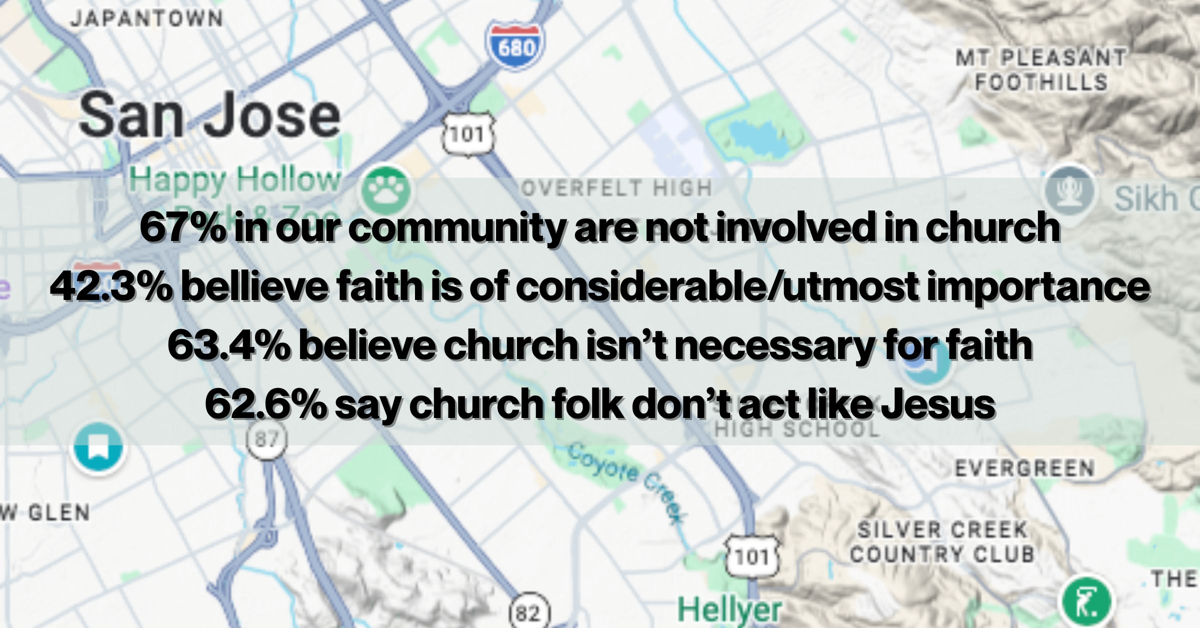 Church attendance is down everywhere. And itโs not just attendance. Peopleโs attitudes are shifting away from church. Not Jesus. Not God. Not the teachings of Christ. But organized religion is becoming a tougher and tougher pill to swallow.ย According to Pew Research, 28% of Americans identify as โreligiously unaffiliated,โ up 12% from just 2007.[5] Of those, 49% identify as spiritual or say spirituality is very important to them.[6]ย Itโs not necessarily they donโt believe in God or are not open to the idea of a higher being, but rather something else has convinced them they donโt need a community to develop their faith.ย Surprisingly, 70% of religiously unaffiliated people (which includes atheists and agnostics) say they DO believe in God or a higher power; 67% believe people have a soul as well.[7] In our local area, about two-thirds of people are not involved in a religious institution and yet over 80% find religious faith to be somewhat important to their lives, and 42.3% find it to be either of considerable or utmost importance.[8] They just donโt think they are going to find God in the church. In a survey of our community (of OUR community!) the number of people who said church wasnโt necessary for faith was 63.4% and the percentage of people who said church folks donโt behave like Jesus went up by more than 100% – from 28.2% all the way to 62.6% in just four years.[9] If we are going to help people become disciples of Christ, we are going to have to change.