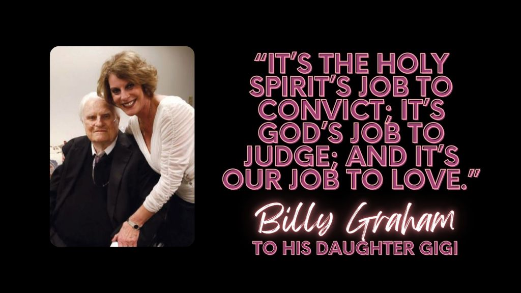 He wrote, “Some time ago I read an interview with Billy Graham’s eldest daughter, Gigi. She was her father’s date to Time magazine’s seventy-fifth anniversary party, a banquet in Washington, DC. President Bill Clinton spoke at the event. He had just been impeached by the House of Representatives for perjury and obstruction of justice. The charge of perjury involved what President Clinton had said, under oath, about his relationship with White House intern Monica Lewinsky. At the banquet, her father sat with President and Mrs. Clinton. He was warm and gracious to them. After the dinner ended and Graham and Gigi were riding back to their hotel, the two discussed difficulties the president and First Lady were going through with so many people gossiping and judging. Gigi said her father’s simple comment was, ‘It’s the Holy Spirit’s job to convict; it’s God’s job to judge; and it’s our job to love.’”[7] A simple but powerful reminder of what we were created to do. Matthew 22: “‘Love the Lord your God with all your heart and with all your soul and with all your mind.’[a] 38 This is the first and greatest commandment. 39 And the second is like it: ‘Love your neighbor as yourself.’”