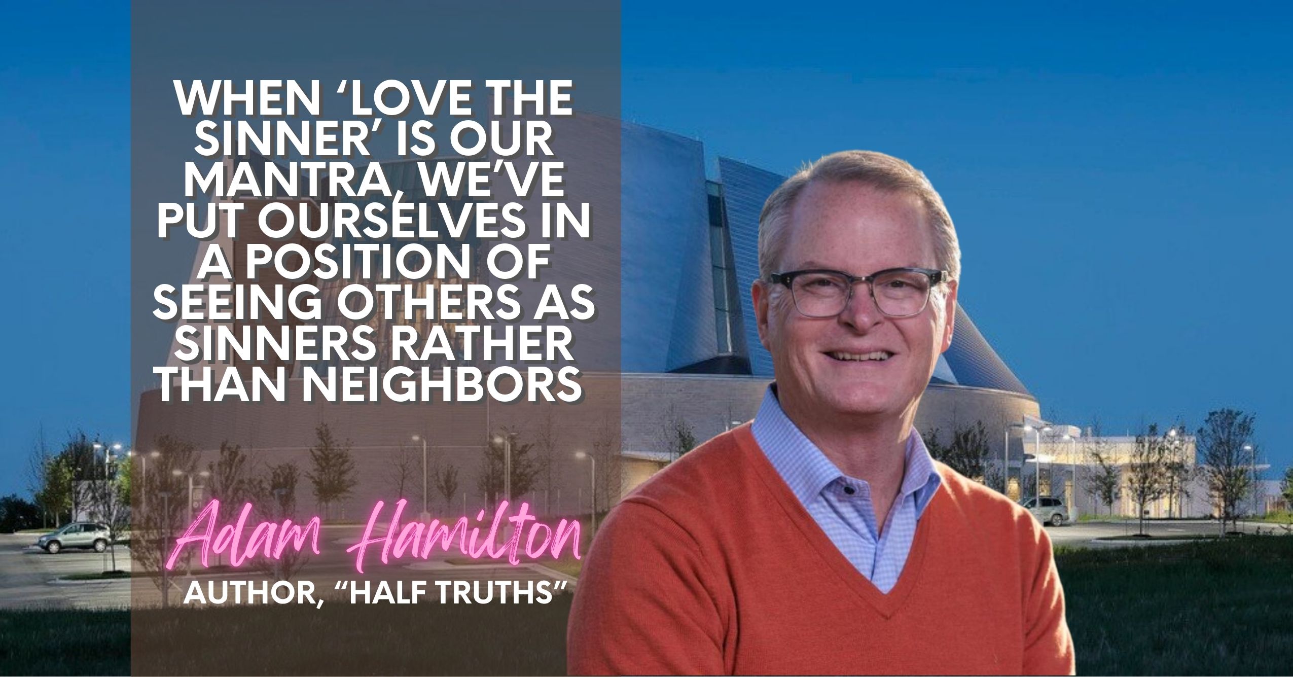 That’s what was wrong with the Pharisee. His pride. “At least I’m not as bad as THAT guy.” It’s that arrogance, that judgmental attitude, to dare to elevate yourself above others that did him in. When we compare ourselves to others like that, it’s an attempt on our part to mitigate our own sin, our own faults, to say that even though I know I’m not perfect, there are other people much worse than I am out there God so you should be happy with me. But God doesn’t care about that. God cares about YOU. That’s why in Romans it says, “for all have sinned and fall short of the glory of God.” Because it doesn’t matter if you’re a little better or a lot better than the next guy. God’s concern is with YOU. God is concerned about YOUR heart. As Jesus said earlier, we need to take the plank out of our own eye before worrying about the speck in our brother’s eye (Matthew 7:3-5). So when we say, “Love the sinner, hate the sin,” we presume that the OTHER person is the sinner. It’s the OTHER person who needs some help. Not us. In his book Half Truth, Adam Hamilton says, “When ‘Love the sinner’ is our mantra, we’ve put ourselves in a position of seeing others as sinners rather than neighbors…I think what turns people off is when religious people point out the sins of others but act as though they have no sins of their own.”[6] We might admit to having sins, but there is this air about us when we start acting judgmental of others that somehow our sins are not as bad as someone else’s.