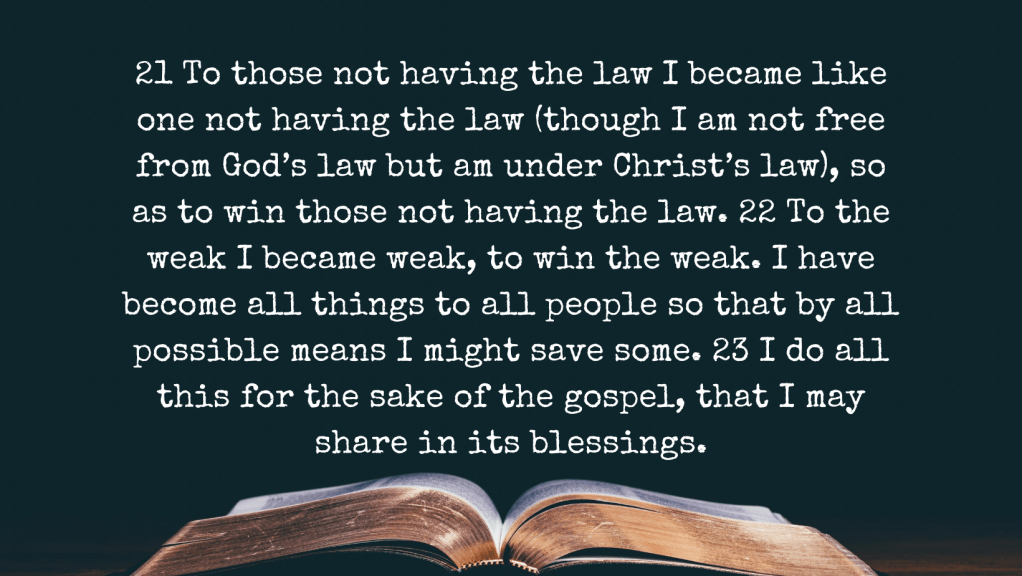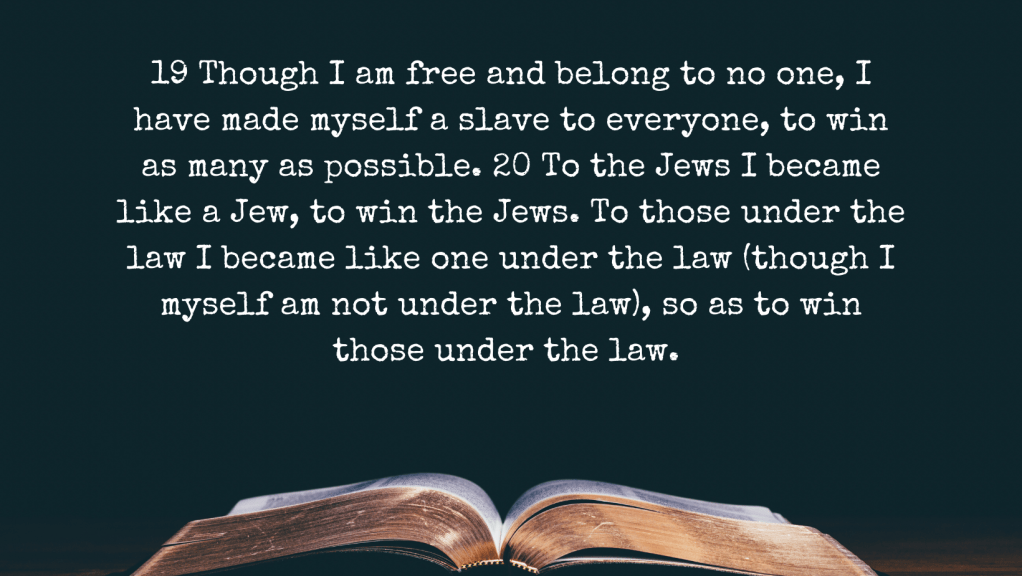 19ย Though I am free and belong to no one, I have made myself a slave to everyone, to win as many as possible. 20ย To the Jews I became like a Jew, to win the Jews. To those under the law I became like one under the law (though I myself am not under the law), so as to win those under the law. 21ย To those not having the law I became like one not having the law (though I am not free from Godโs law but am under Christโs law), so as to win those not having the law. 22ย To the weak I became weak, to win the weak. I have become all things to all people so that by all possible means I might save some. 23ย I do all this for the sake of the gospel, that I may share in its blessings.